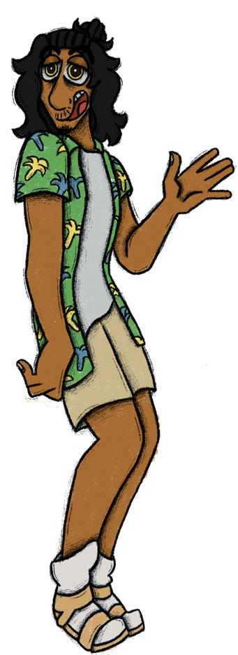 …I think you already know what he’s like just by looking at him. But if you insist I guess I’ll introduce him. This is Alejandro, a trans masc stoner who somehow also landed a job as a police officer. And to Alice’s dismay, is her partner. You know for being stoned basically 24/7 to deal with whatever trauma he is hiding and the crippling dysphoria that sometimes comes along with being trans he's…Actually pretty smart and competent…He’s still stupid though…But he has a heart of gold…He’s like a golden retriever if it was drunk constantly, or an analogy I should have started with a surfer dude stereotype. Surely that’s all there is to him and he has no interesting background whatsoever…Right?